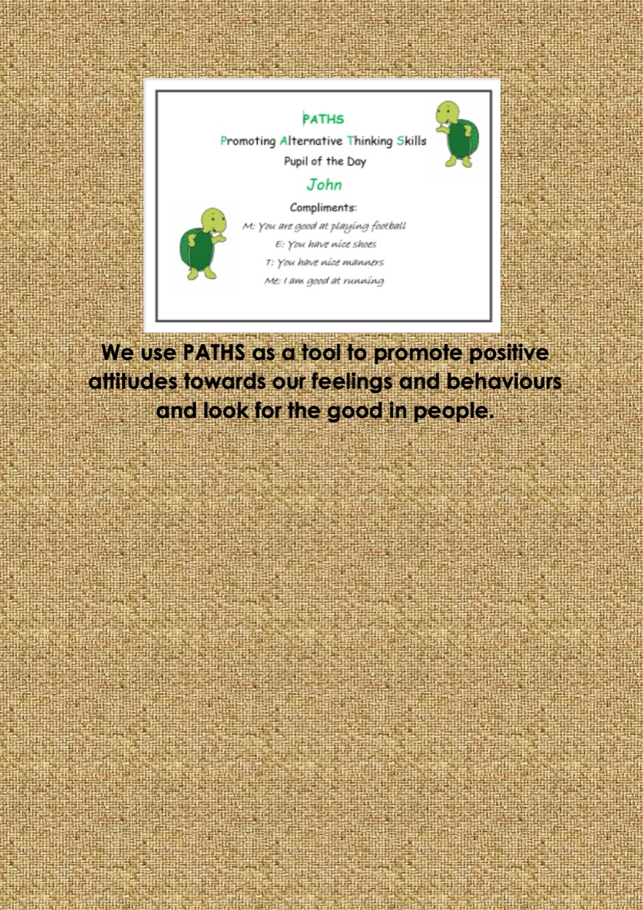 Teachers plan daily PATHS sessions, giving compliments to the PATHS pupil of the day, and have weekly sessions learning about feelings, behaviour of themselves and of others.